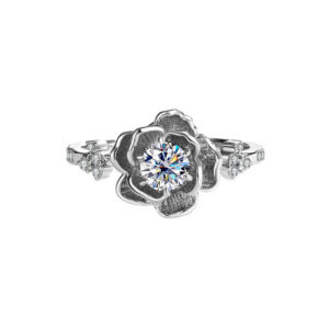 A stunning floral-inspired ring featuring a sparkling central diamond set in a delicate silver blossom, symbolizing elegance and timeless beauty.